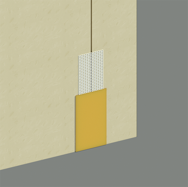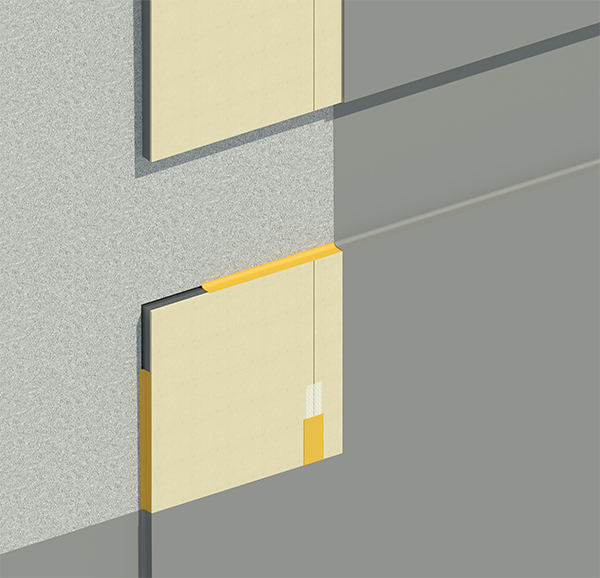 Nas interseções entre concreto e estrutura metálica do Steel Frame, aplica-se massa acrílica reforçada com tela, compensando os diferentes movimentos entre os materiais e evitando fissuras.