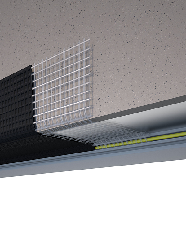 As áreas perimetrais das janelas recebem um reforço especial por meio de tela fixada mecanicamente ao perfil de alumínio e ancorada na parede, garantindo maior estanqueidade em pontos críticos.
